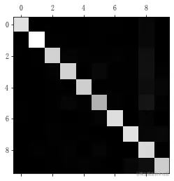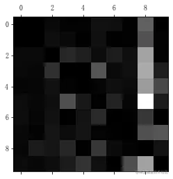 首先解释一下cmap=mpl.cm.gray的作用:这样plt画出的图像的颜色会根据矩阵的数字大小而呈现黑白两色,数值越高颜色越白。我们可以看出,对角线上是最亮的,对角线的含义看上一篇文章《分类二》,这说明了预测的比例还是比较高。