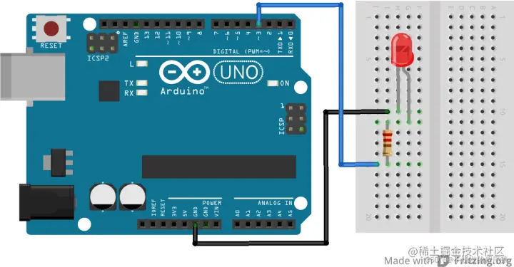 将LED的阳极过220Ω限流电阻连接至Arduino Uno控制板的数字引脚D3上,将LED的阴极接至GND上。本实验的硬件连接如下图所示: