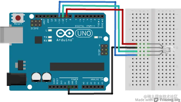 将共阳RGB模块的阳极接至Arduino Uno控制板上的5V引脚上,R、G、B引脚分别接至具有PWM功能的数字引脚9、10、11上,如下图所示: