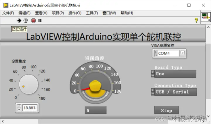 点击运行按钮,LabVIEW程序开始执行,通过调节设置角度的旋钮,可以看到舵机随着角度的改变而转动,同时,当前角度值也随着舵机的转动而实时改变。