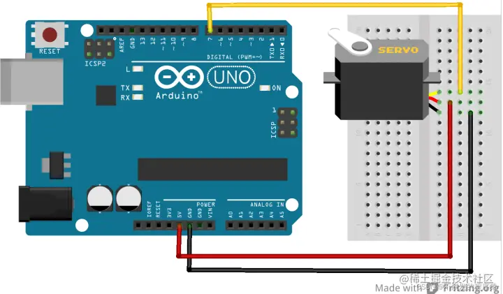将9g舵机的电源线分别接至Arduino Uno控制板上的5V和GND引脚上,信号线接至数字引脚D2上,如下图所示: