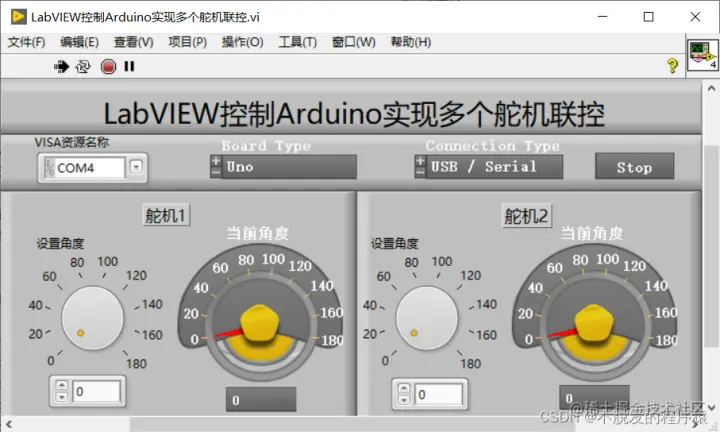 点击运行按钮,LabVIEW程序开始执行,通过舵机1和舵机2的调节设置角度旋钮,可以看到舵机1和舵机2随着角度的改变而转动,同时,舵机1和舵机2的当前角度值也随着舵机1和舵机2的转动而实时改变。