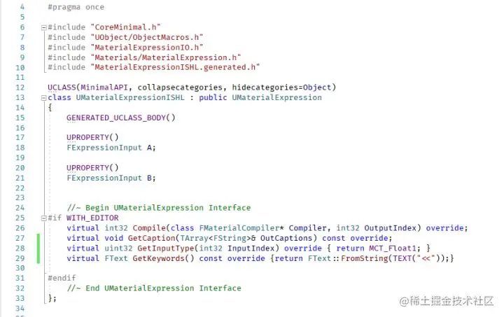 打开 \Engine\Source\Runtime\Engine\Public\MaterialCompiler.h ,在 class FMaterialCompiler 里和 class FProxyMaterialCompiler 声明一下这个节点干活的函数,函数里的 A 和 B 指的是连在这个节点 A 和 B 上的节点的 ID