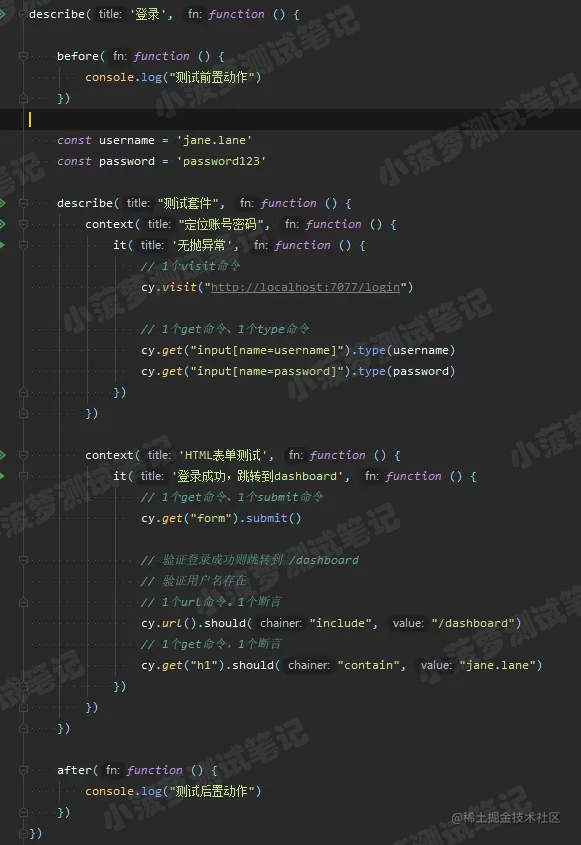 Cypress 将 Mocha 硬编码在自己的框架中,所以编写测试用例都是基于 Mocha 提供的如下基本功能模块: