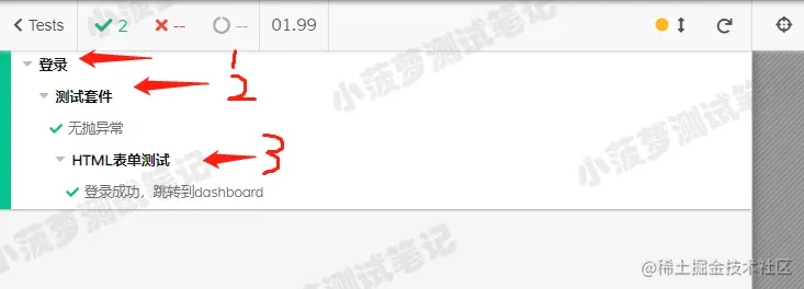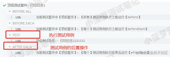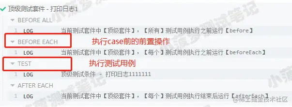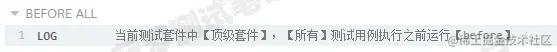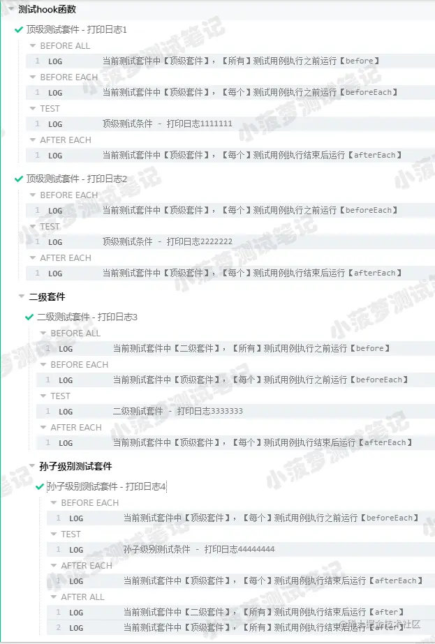 若包含多级测试套件,那么父级套件、祖父级套件声明的 hook 函数会作用于所有子级套件的测试用例,孙子级套件的测试用例...以此类推 (如:栗子中的二级套件、孙子级套件)