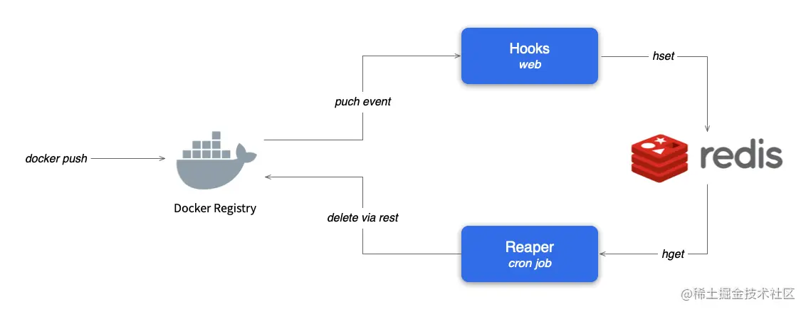 Hooks 将 event 中的镜像信息解析并记录在 Redis 中,主要是记录镜像的过期时间;同时有个 Reaper 的定时任务定期从 Redis 获取镜像的信息,过期的镜像会调用 Registry 的 REST API 进行清理。