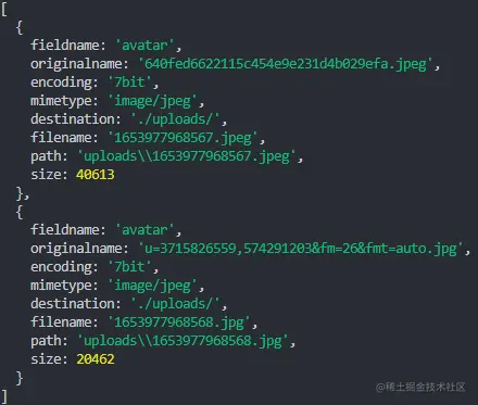 如果我们想一次性上传多张图片,那么可以将upload.single改为upload.array,但是这些图片的名称都要是我们指定的才行。而且现在如果想查看图片信息的话就不能再使用req.file了,而是需要替换成req.files