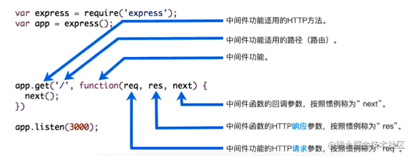 // next函数里面并不能有参数,有参数就代表有错误,所以不能通过给next传参的形式将数据传递给下一个中间件