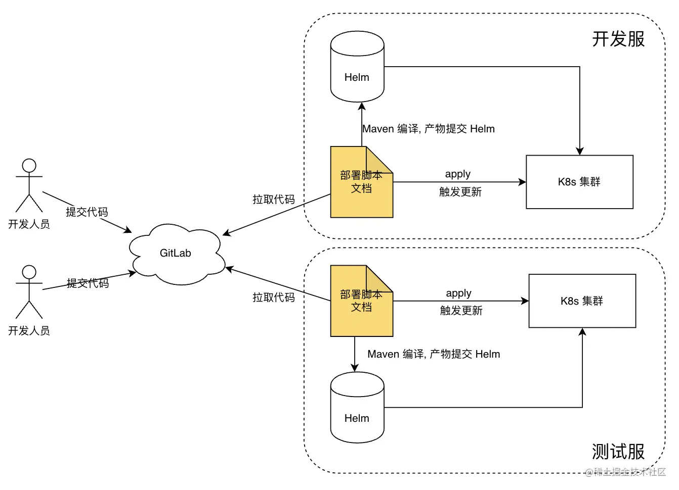 - 开发人员提交代码后需要手动去触发部署脚本,一方面是可能会被遗忘,另一方面是很被动