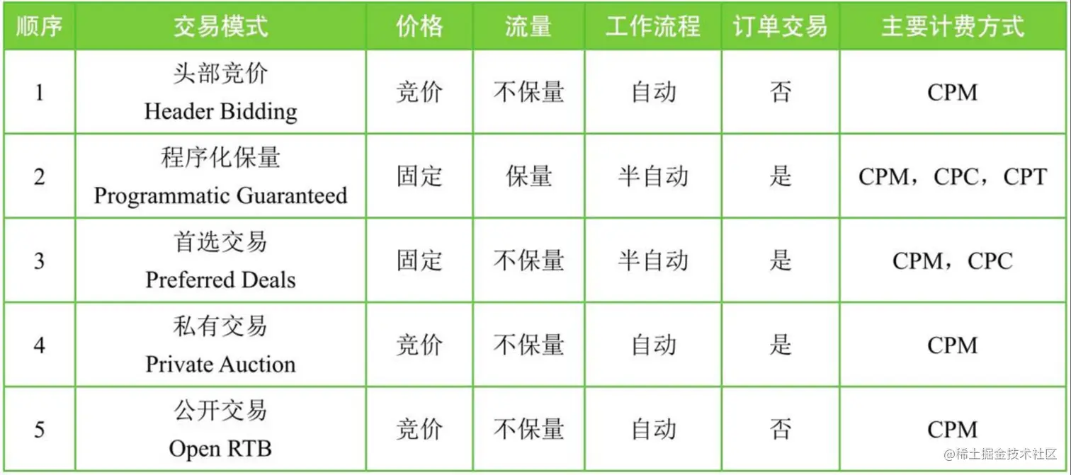 | 半程序化 | 广告网络(AD Network,ADN) | 批量地运营媒体广告位(供给方代理),按照人群或上下文标签售卖给需求方,并用竞价的方式分配流量 | 千次展示收益达不到合约广告水平的剩余流量 |