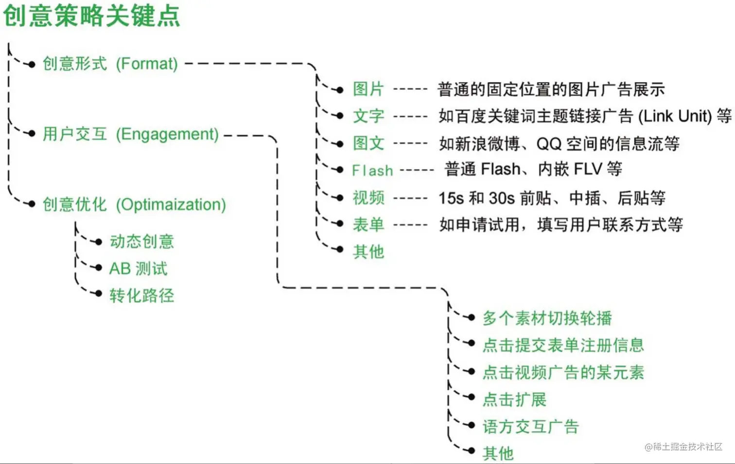 - 类型划分:条幅广告(banner ad)、邮件营销(Email Direct Marketing,EDM)、视频贴片(插入广告)、开屏广告、激励广告(观看、下载)、推荐墙(导航、渠道排名)、信息流广告、积分墙(刷榜)、固定文字链广告(Textural ad:搜索引擎),富媒体广告(Rich-media ad,图文广告),视频广告(video ad)