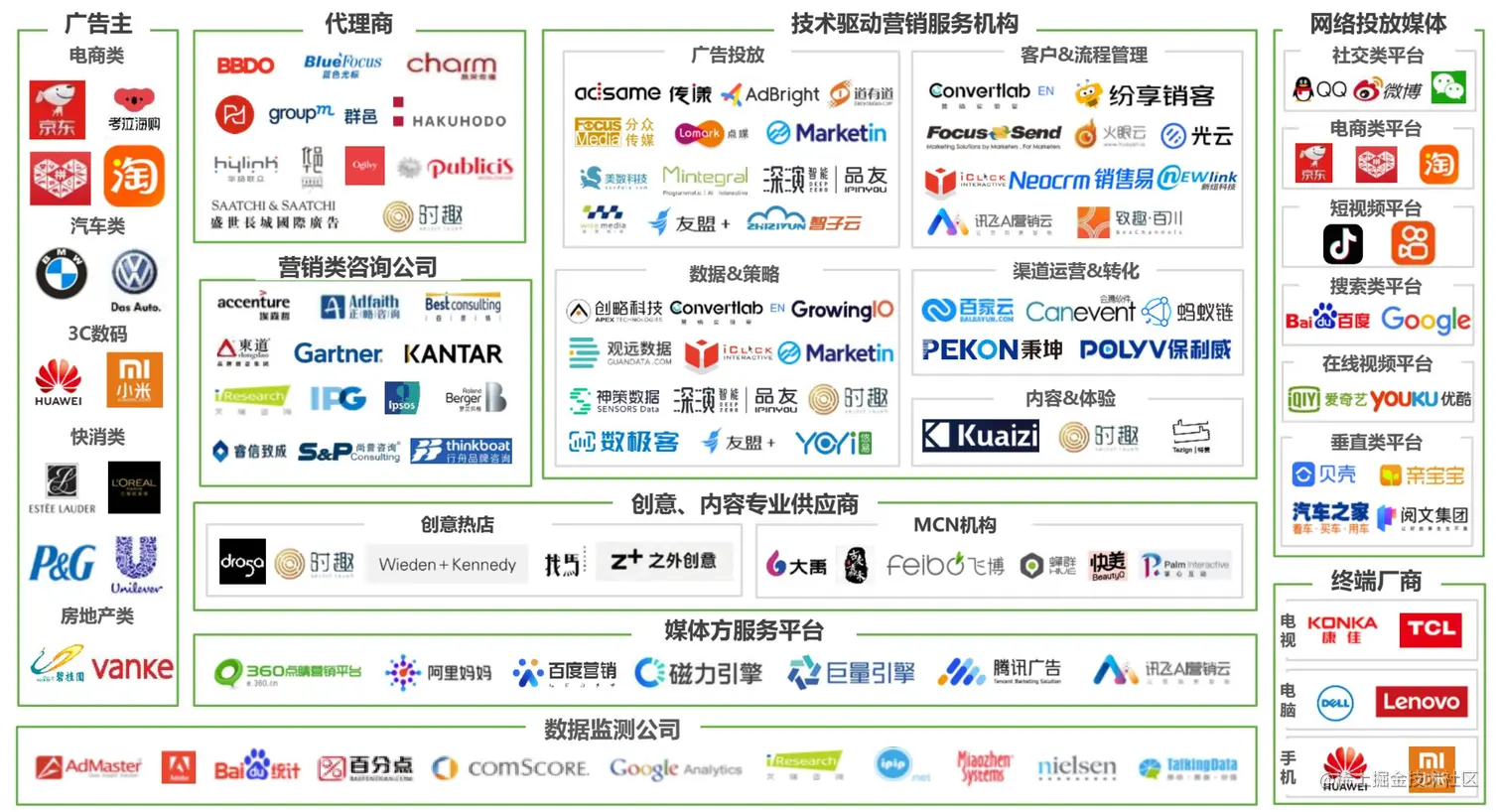 - 广告联盟(Ad Network,简称AdN):又称广告平台或广告网络,即媒体代理公司,通过为广告主采购媒体流量,赚取中间差价,如百度网盟、阿里妈妈网盟。