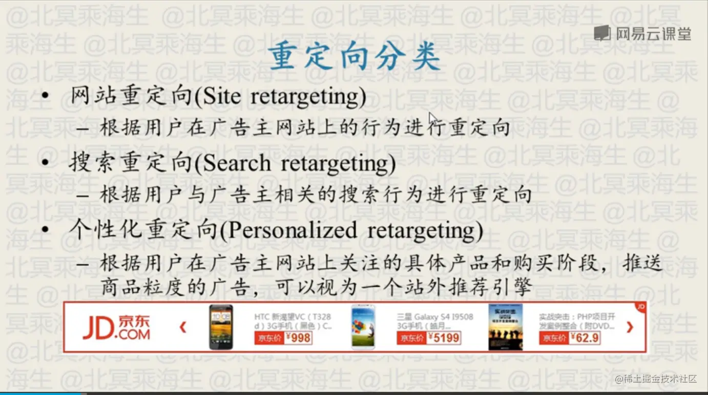 - Retargeting:重定向投放,广告主可以对那些自己的网站看过某类商品的用户进行重定向,锁定用户、唤醒用户,并促使其完成购买行为。