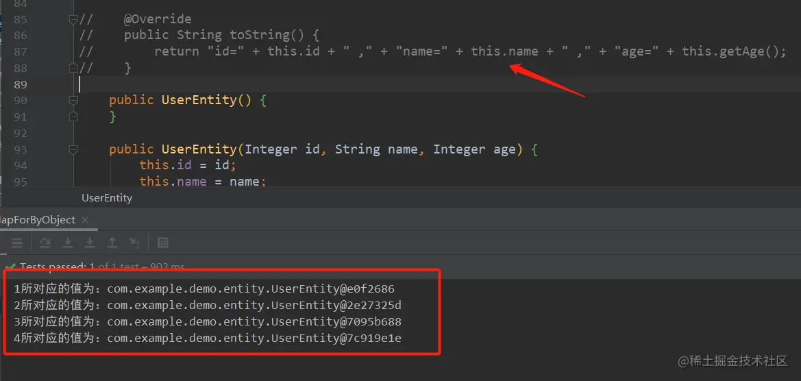 其中对于UserEntity对象,为何能打印其对象具体内容,因为我这是重写了toString(),像你们如果直接创建的对象且就这样直接进行对象遍历输出,next.getValue()所获取到的值且打印的出来的就是其对象的内存地址,所以如果你想具体打印其对象的内容,你们可以在你们所定义的实体类中重写toString方法即可。比如如下我的,仅供参考: