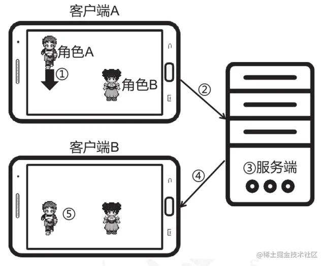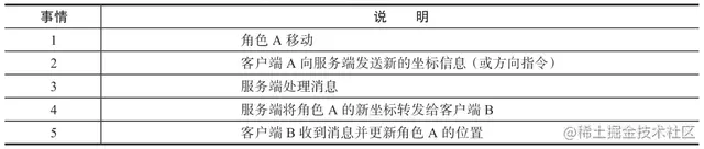 客户端和客户端之间通过服务端间接通信。例如在MMORPG中,角色A移动一步,玩家B会在自己屏幕中看到角色A的位置变化,“走路”的背后至少发生了表1-1所示的5件事情。
