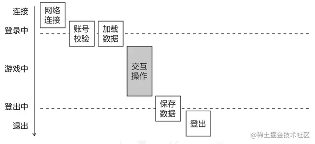 - 登出阶段:玩家下线,服务端把角色的数据保存到数据库中。对于保存角色数据的时机,不同的游戏会有不同的处理方式。比如,有些游戏采用定时存储的方式,每隔几分钟把在线玩家的数据写回数据库;有些游戏采用下线时存储的方式,即只有在玩家下线时才保存数据。