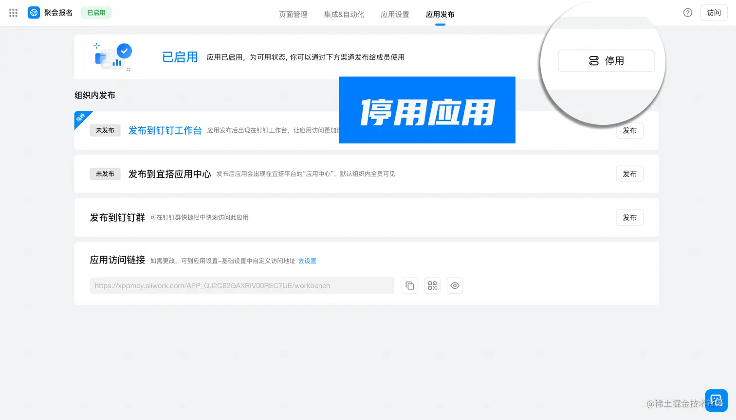 如何停止我们的应用进行数据收集呢?钉钉宜搭支持停用应用,当我们的应用不再需要使用的时候,我们可以将应用进行停用,停用后的应用无法提交数据。