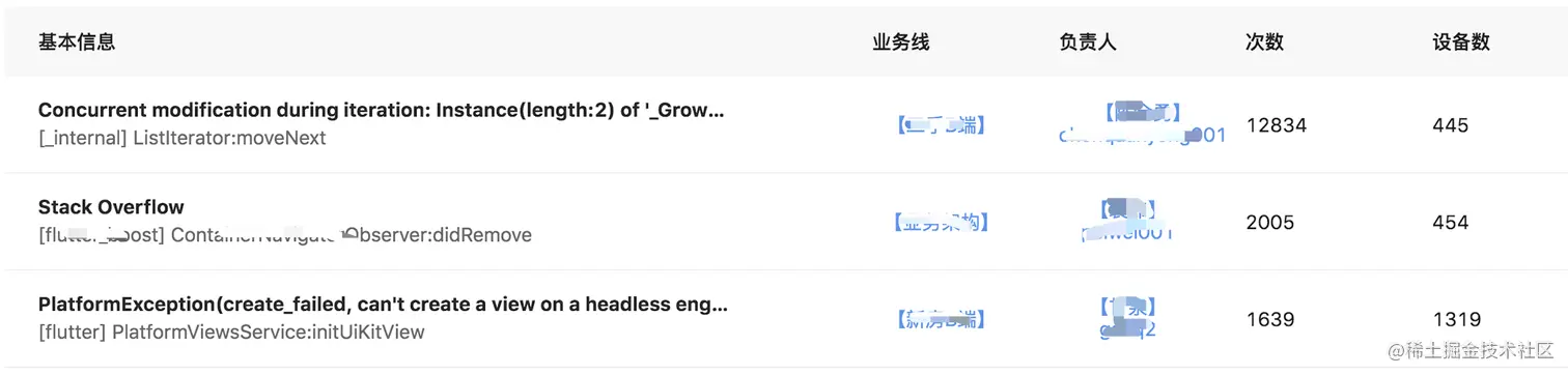2、对于没有业务栈帧的异常,根据异常的种类来分配,比如是白屏问题,就根据上文提到的异常附加信息中的页面信息,来进行指派. 最终效果如下所示: