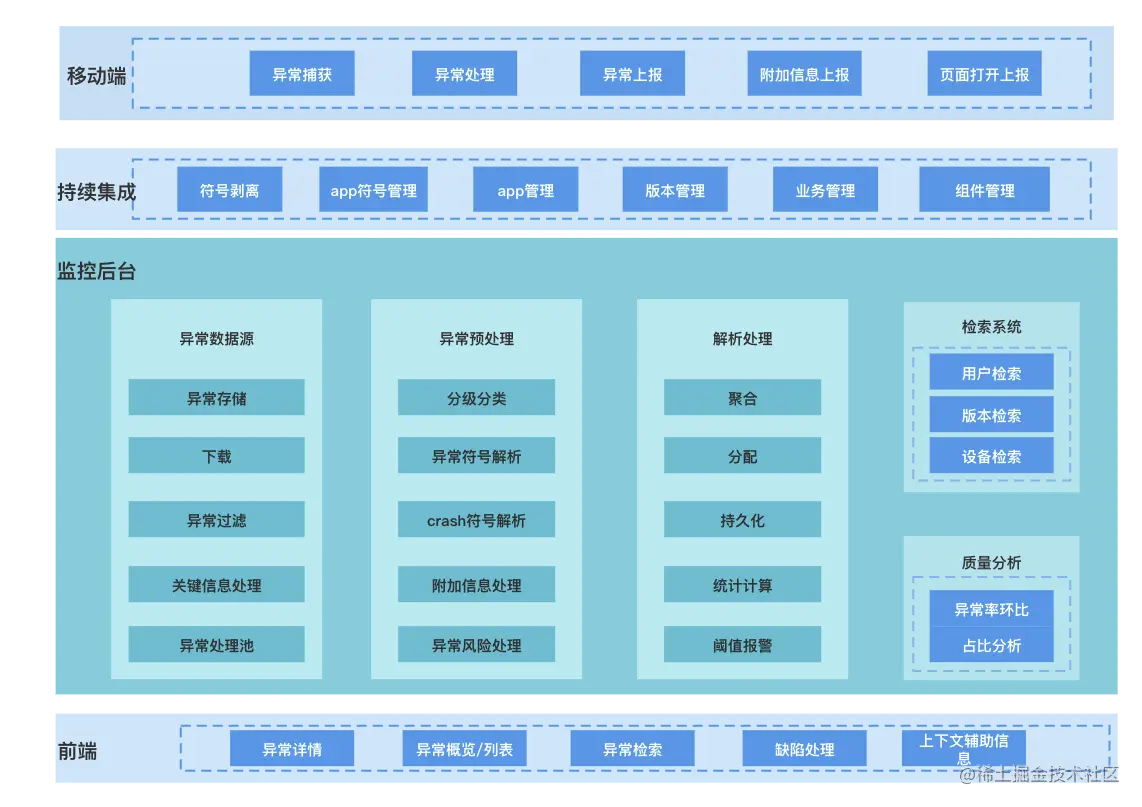 一般来说,监控系统都会包含问题的实时收集上报、问题的归类识别(聚合)以及自动分配、问题定位、实时报警等几个模块.要做一套 Flutter 异常监控也不例外,图中是贝壳在 Flutter 异常监控的整套方案.首先在端上收集异常并进行初步处理,持续集成平台会处理各平台的 app 符号信息并管理 app 相关的基础信息,在监控后台,系统主要处理异常日志数据源,并经过预处理、解析、构建多纬度统计数据、最终展示到前端平台、并会根据一些阈值配置进行异常报警.