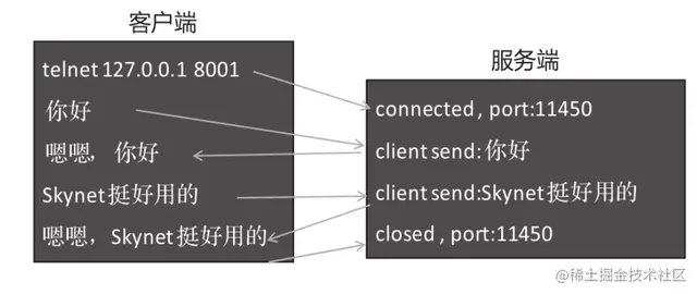 现在做个测试,使用可以发送字符串的TCP客户端连接服务器(例如Linux下的Telnet程序),然后输入任意内容,看看服务端将会有怎样的输出。图1-9展示了客户端和服务端的输出内容,箭头代表消息的流向,服务端监听端口为8001,客户端的端口为11450。