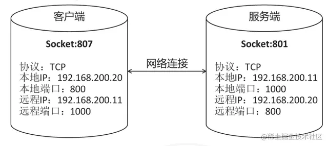 网络连接的每一端都需要存储一些信息,这些信息至少包括:连接使用的协议、自己的地址、对方的地址、将要发送的数据、接收到的数据等。存储和处理这些信息的结构称为套接字(Socket)。图1-7展示了套接字包含的内容,每个Socket都包含网络连接中一端的信息。每个客户端需要一个Socket结构,服务端则需要N+1个Socket结构,其中N为客户端的连接数,另外一个是服务端打开监听的套接字。
