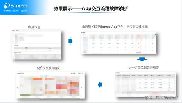 在App交互流程故障诊断方面,用户在收到报警后由报警关联至Bonree App平台,定位到关键步骤,进一步定位到关键动作,配合交互快照验证。例如在一次告警服务中,从告警到定位问题再到解决问题,仅用了十五分钟,用户甚至都未察觉到问题。