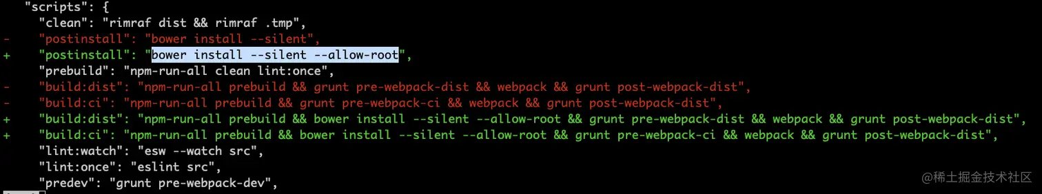 "postinstall": "bower install --silent --allow-root",
