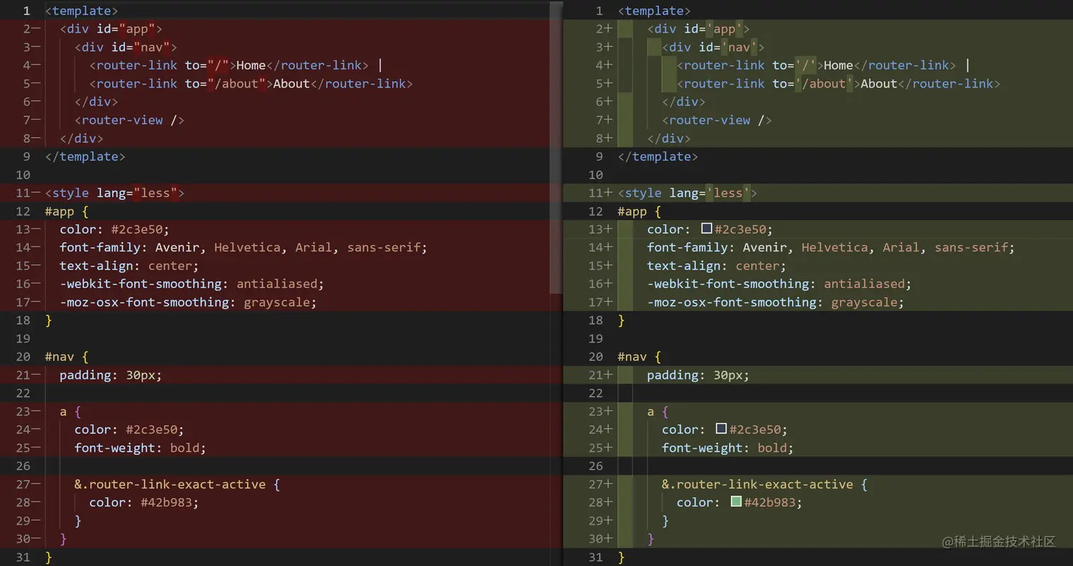 如下图所示,提交的文件内容其实没有变化,只是代码风格变了(双引号变成了单引号,缩进从两个字符变成了四个字符),但是diff时大段代码会标红,不利于我们查看提交的修改。