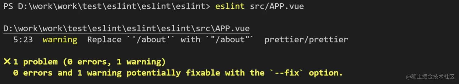 当我们用命令行执行eslint xxx.js检查上述文件时,就会发现eslint给出报错信息。