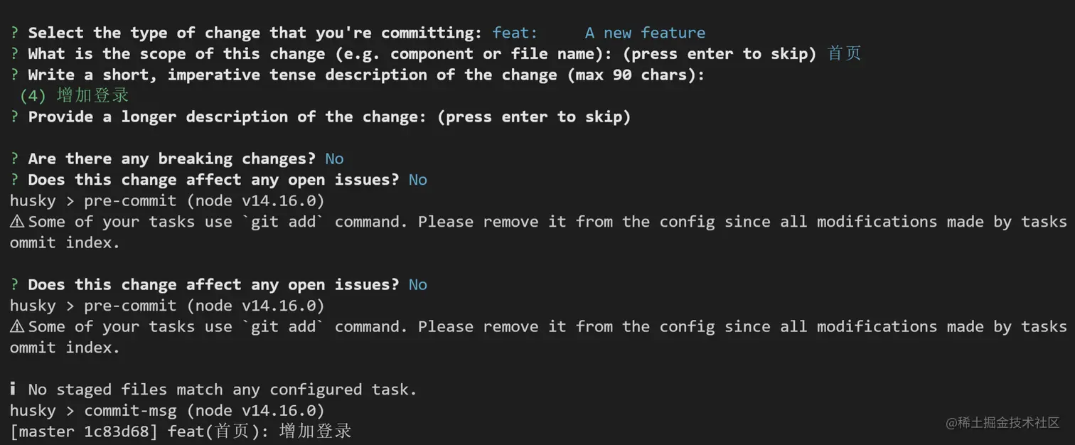 配置完成之后,我们就可以通过执行npm run cm来代替git commit,接着只需要安装提示,完成header、body和footer的编写,就能够编写出符合规范的Commit Message。