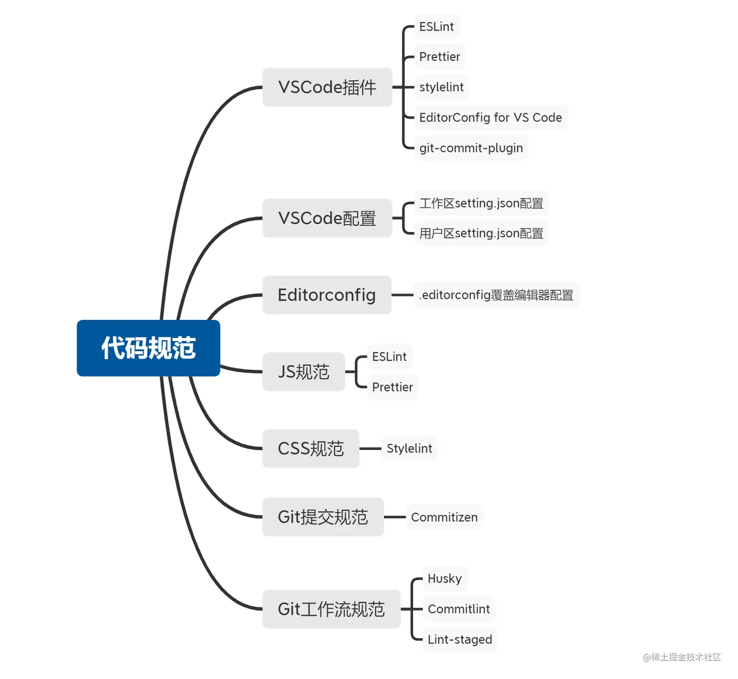下面主要列举了我们团队现在主要采用的一些Lint检查工具,以及相关的VSCode辅助插件,帮助我们完成JS代码规范、CSS代码规范和Git工作流规范的检查。
