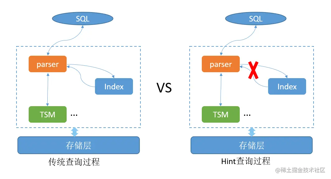 GaussDB(for Influx)通过定义特殊的hint语法来识别查询语句是否走倒排索引,系统解析业务查询语句时,如果识别到查询带有hint语法,就会跳过倒排索引查找的步骤,直接根据查询语句中tagset信息,找到数据源,去存储层查找对应的数据,其逻辑对比如下图: