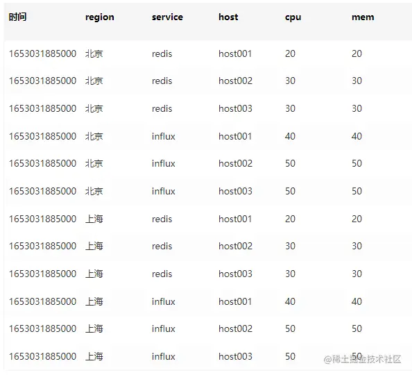 2)给定部分维度,查询某些信息:例如要查询北京(region)的Influx(service)服务的cpu使用情况: