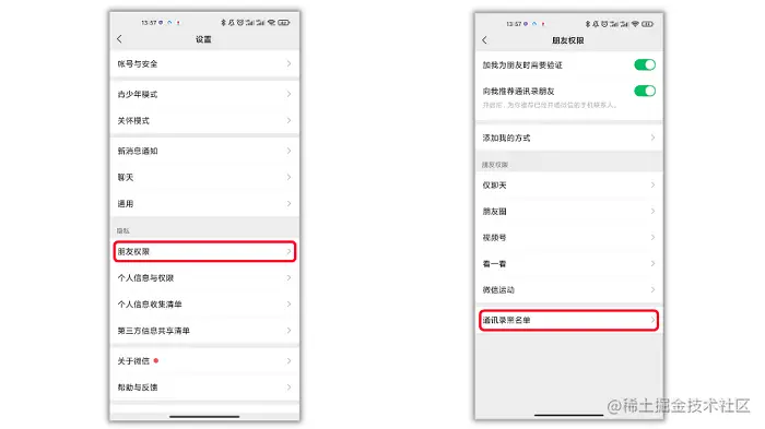 步骤2.找到并点进去“朋友权限”这个设置,进入之后你就可以看到,有一个“通讯录黑名单”,我们点击它;