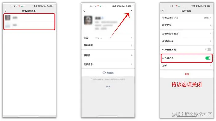 步骤3.你拉黑过的微信好友都会在这里面显示,找到你想找回来的微信好友并点击他(她)后,再点一下右上角“…”,最后将“加入黑名单”这个开关给关闭,就成功解除与该好友的黑名单了,你的好友就成功找回来!