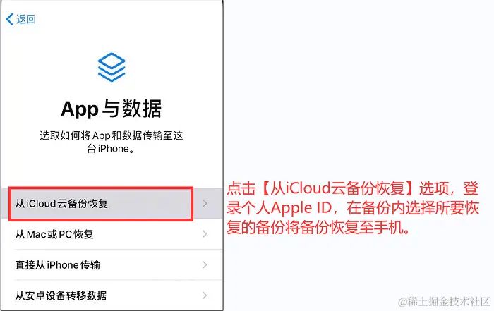 步骤2:等待手机出现重新启动之后的界面之后,在【App与数据】页面里选择【从iCloud云备份】输入ID登录iCloud后选择备份的数据后即可开始恢复。