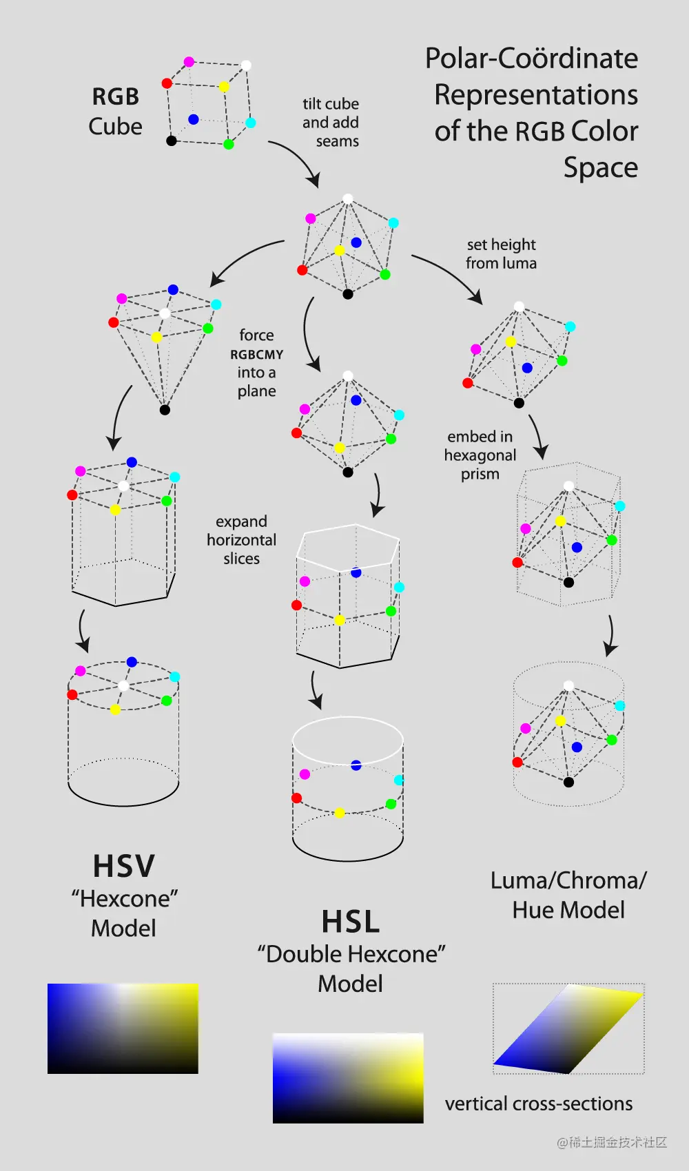 RGB倾斜 => 拉成双六棱锥 => 转成六棱柱 => 转为圆柱