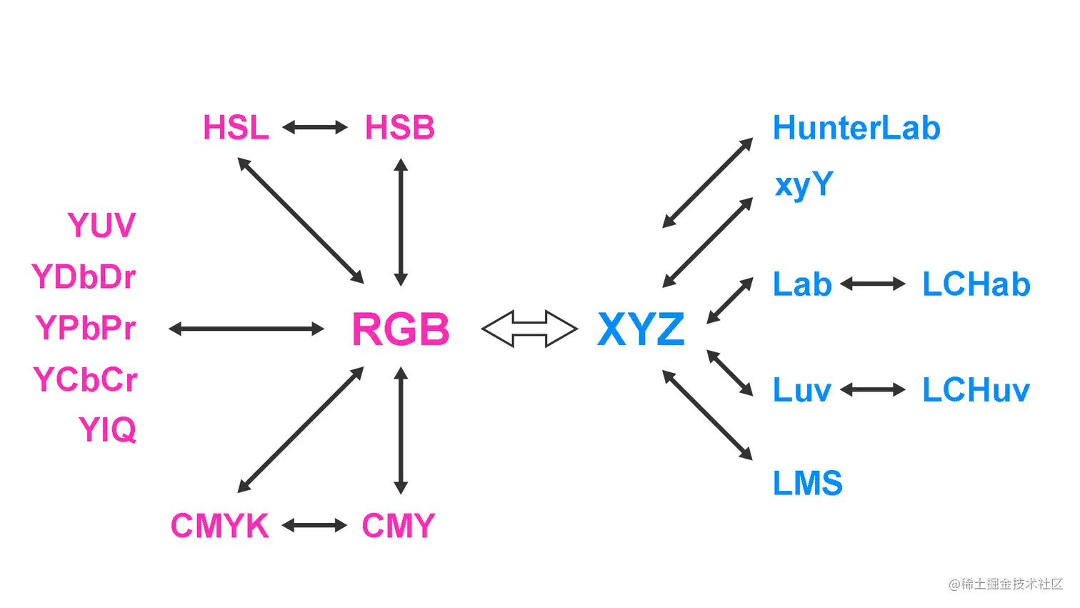 通常来说,按照是否设备相关,我们可以将色彩模型分为设备相关色彩模型以及设备不相关的色彩模型,基于此大致可以分为两大体系,即:RGB体系及XYZ体系,这里我们将介绍以下几种常见的色彩模型:RGB/CMYK、YUV/YCrCb、HS*、Lab、XYZ,下面将分别介绍下相关的颜色模型。