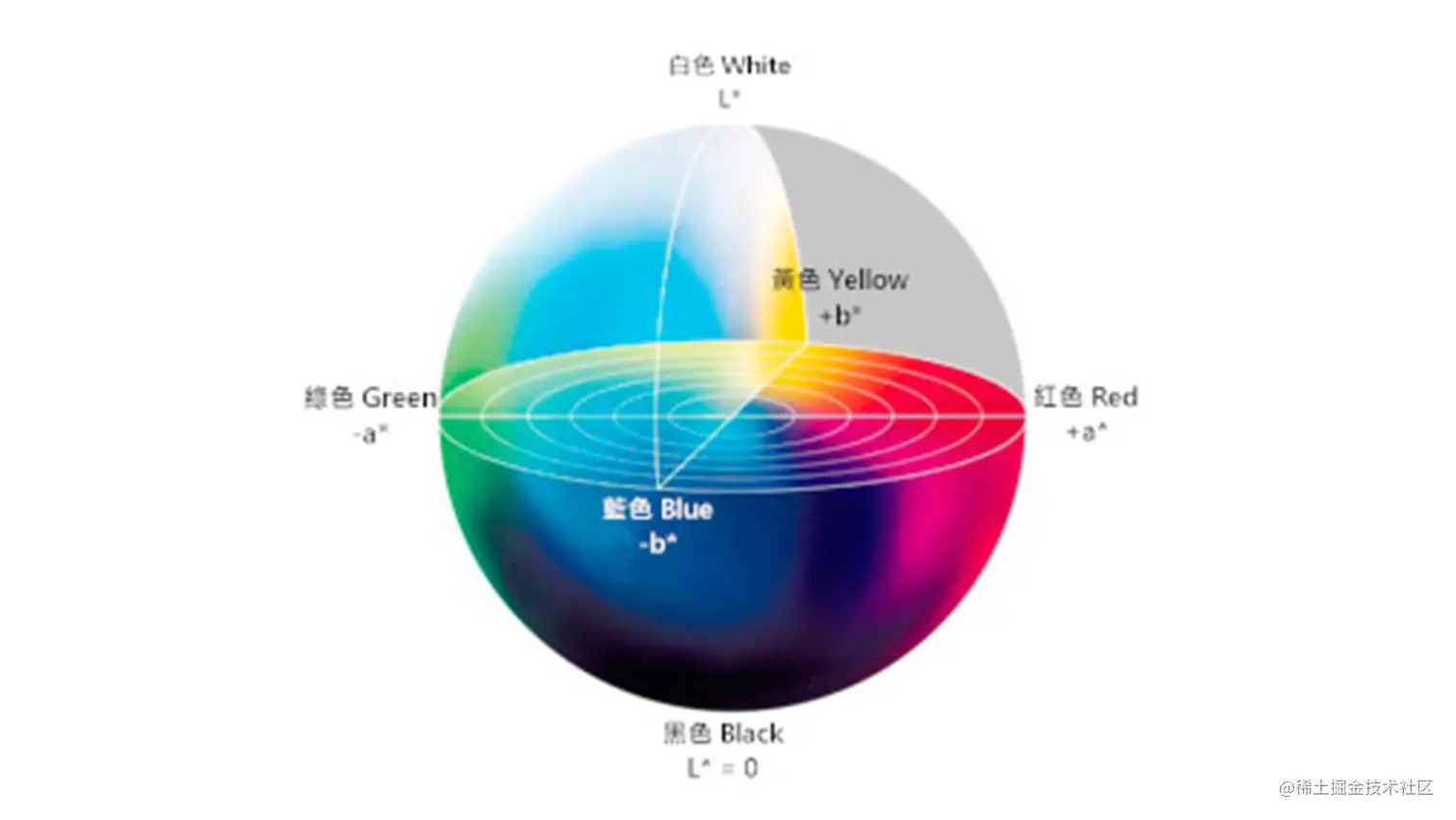 随着发展,人们对色彩的研究不再局限于设备基础条件的限定,由此,CIE(Commission Internationale de Photométrie)国际照明协会提出了Lab模型,其不同于RGB的模型,其中L代表亮度,而a则是从深绿色(低亮)到灰色(中亮)再到亮粉红色(高亮)的过渡,b则是亮蓝色(低亮)到灰色(中亮)再到黄色(高亮)的过渡,其合成模型如上图所示。