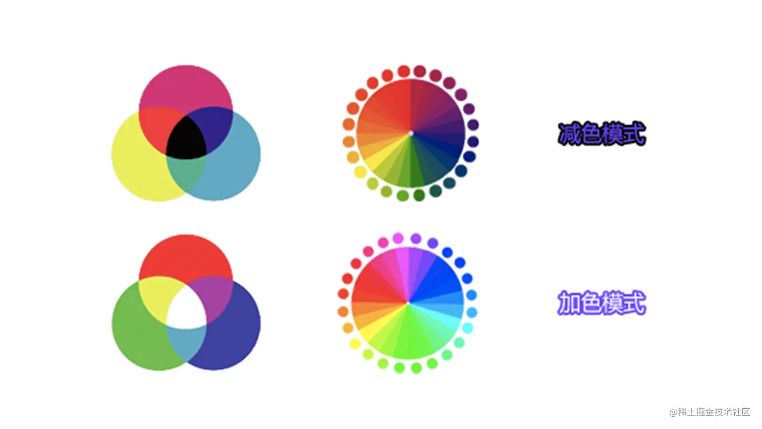 在介绍加色模式和减色模式,我们先来看下我们从小学到的关于色彩的一些基本知识。我们之前上学的时候,美术老师可能教过三原色和三基色的概念,或者区分光学三原色和色彩三原色等等,这其实就已经是加色模式和减色模式的一个初步了解了,本质来说:三原色或者说三基色都是基于不同环境下材料而提出的一种基本色彩而已,我这里以光学三原色和色彩三原色来区分,光学三原色是:红(R)、绿(G)、蓝(B),也是我们前端开发过程中常用到的元色;而除了光学三原色外,还有一个色彩三原色,或者叫美术三原色,它们是:红(M)、黄(Y)、蓝(C),这个是印刷或者绘画过程中常常用到的元色。相信细心的同学已经发现我在标注英语的时候,色彩三原色和光学三原色里的红色及蓝色好像是不一样的,没错,正是由于不同场景下对于色彩使用的不同,而对色彩进行加合的过程中出现了不同的模式。这里,就要引出我们这一部分的核心理论了,即:加色模式和减色模式。