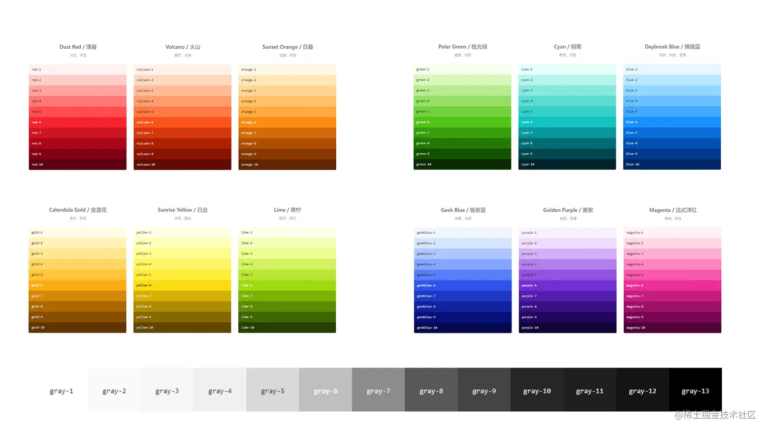 对于色彩系统的分类,这里我将以蚂蚁金服的ant design色彩体系作为样板来进行描述。
