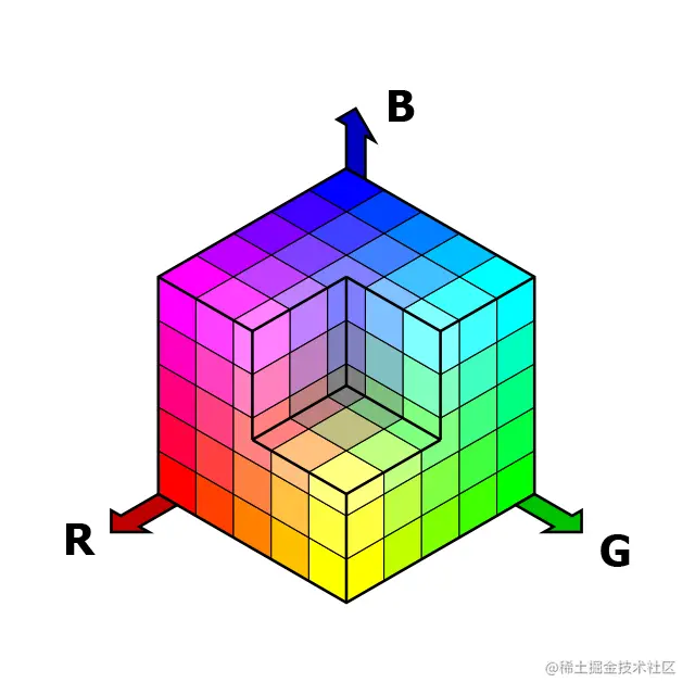 RGB模型是典型的加法模型,其通过设立RGB为三个基色进行多种颜色的不同模型组合,其中R/G/B分别作为三维欧氏空间中的维度表示,对颜色进行相关的构建,如上图所示。