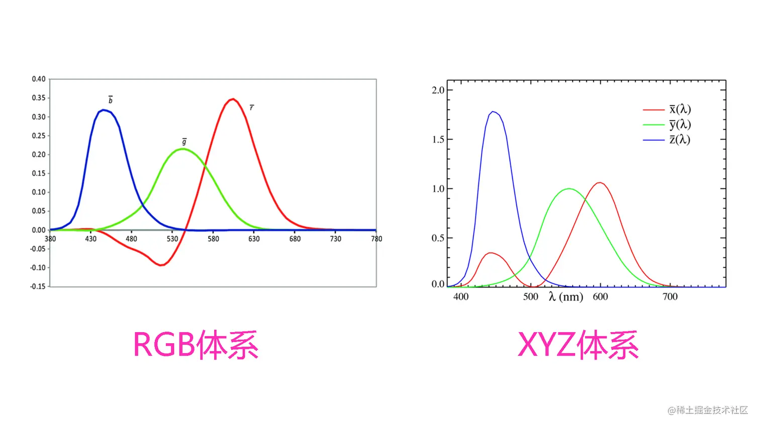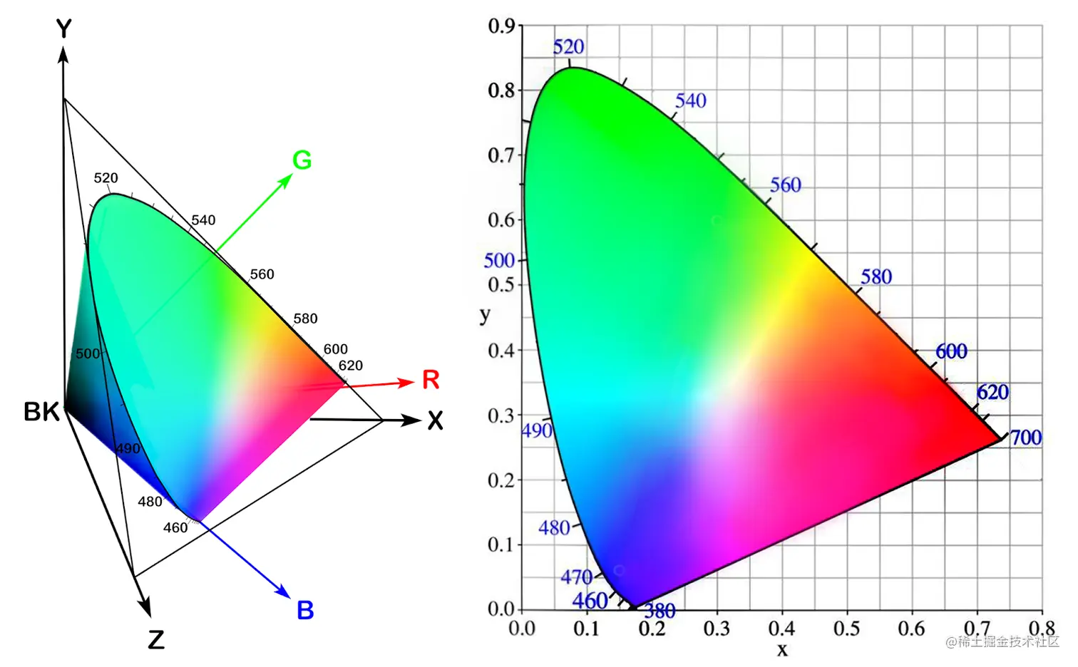 在上一个Lab模型中我们知道,CIE对色彩做了进一步的调研研究,其实Lab模型也是XYZ模型的一个衍生变种,其对RGB模型中的光源做了坐标系方面的区分,其对三元色进行了相关的修正,其是设备无关的,如上图所示,在欧氏空间中,两个坐标系发生了偏移。(ps:具体的变化,可以参考这篇文章RGB色彩体系和XYZ色彩体系)