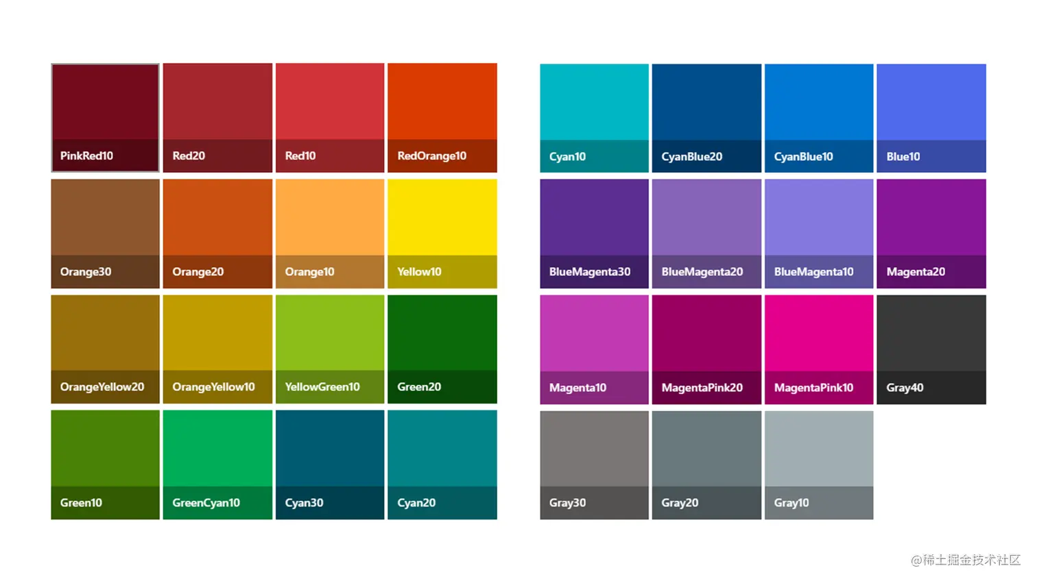 在介绍了所有的色彩相关的模型、计算等等之后,我们来看一下前端中关于色彩计算的一些应用,这里我们以蚂蚁金服的 Ant Design 色板的生成算法作为案例进行一些简单的分析,来看一下色彩计算在组件库中的具体落地,对于更为详细的介绍,大家可以看一下偏右大佬所写的这篇《Ant Design 色板生成算法演进之路》,这里我仅仅做一下个人的理解与分析简述。