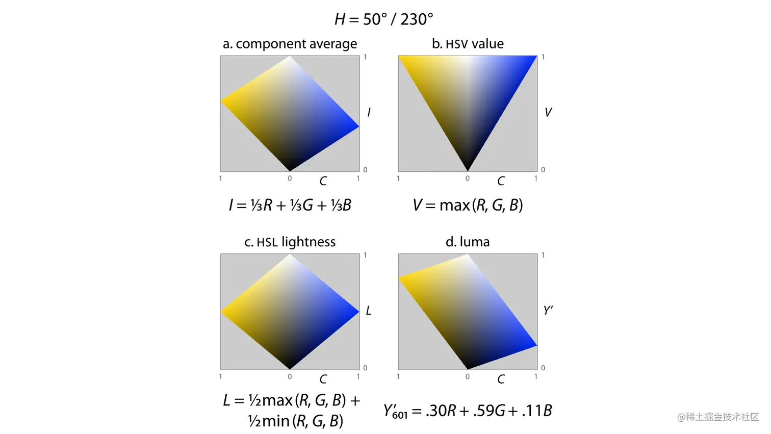 对于人的视觉而言,其实通常最容易描述的就是基于色相(Hue)、饱和度(Saturation)以及最后这一个明度或者说亮度来区分,但是对于最后两个指标而言,不同模型的构建其实是不太一样的,这里我们将重点介绍两种模型,即:类HSL和类HSV模型