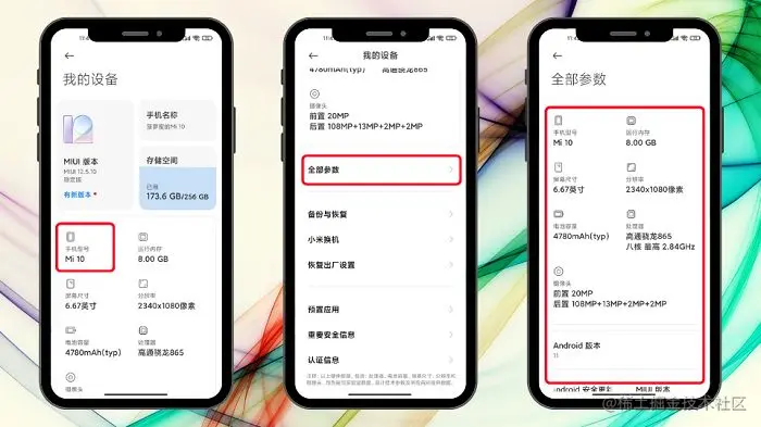 步骤2.这里可以看到你的小米手机型号了,如果想要查看更多详细参数信息的话,可以下拉到下面,并点击“全部参数”,就可以查看手机内更加详细的配置版本等信息了!