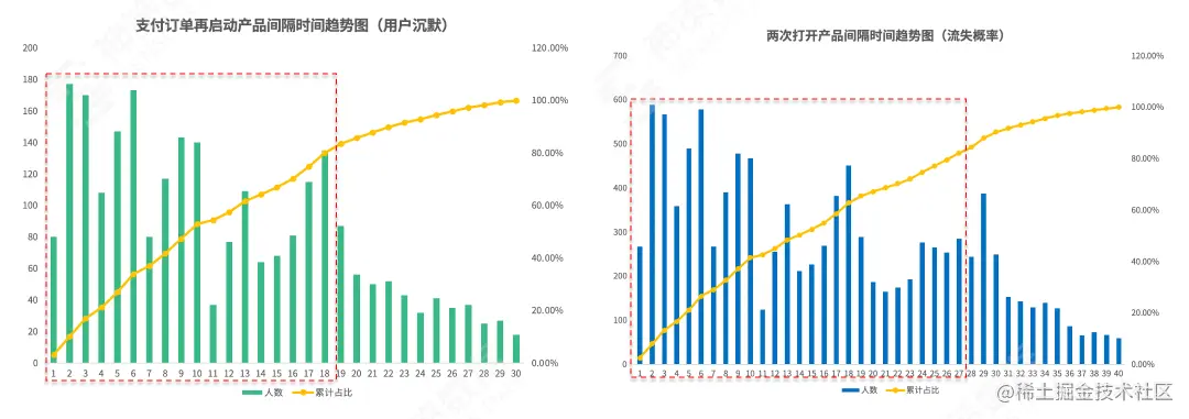 从「支付订单」到「再次启动产品」的时间间隔趋势图来看,80% 的用户在「支付订单」后会在 18 天内重新「启动产品」。因此我们可以将沉默期定义为在支付订单 18 天后「未启动产品」的用户。
