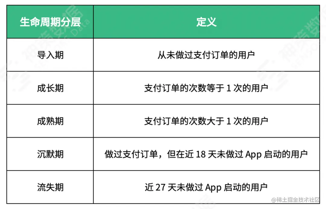 从两次打开 App 间隔时间趋势图中可以看到,80% 的用户会在 27 天内重新启动产品, 因此我们可以将流失用户定义为超过 27 天没有「启动产品」的用户。那么,我们对用户生命周期的五个分层的明确定义可以如下: