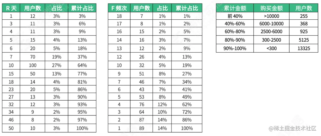 RFM 中三个维度的阈值并不是一成不变的,它需要随着最终划分的人群以及相关的运营效果、活动规律,调整阈值的设定,最终达到一个最合理的划分。因此我们会通过“二八法则”对 RFM 值进行划分,这也会方便我们在后续迭代优化中根据业务反馈调整相应的阈值比例。
