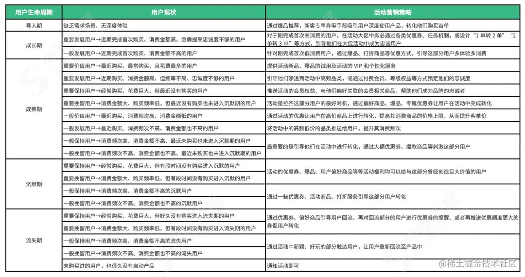 将「用户生命周期」和「价值分层」结合起来后,不仅对不同阶段用户的策略更有针对性,也可以根据用户的价值分层有优先级地投入有限的资源。在活动预算有限时,对于重要分层的用户,可以做一定的倾斜,对于一般分层的用户,则可以不做太多额外的动作,节省资源。以下为我们列举的用户分层和策略,以供参考: